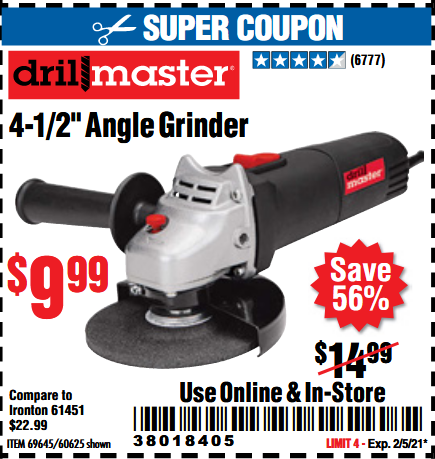 DRILLMASTER 4-1/2" ANGLE GRINDER Lot No. 69645/60625 Expired: 2/2/21 - $9.99 Coupon Code: '14040625'