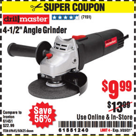 DRILLMASTER 4-1/2" ANGLE GRINDER Lot No. 69645/60625 Expired: 3/23/21 - $9.99 Coupon Code: '61551240'