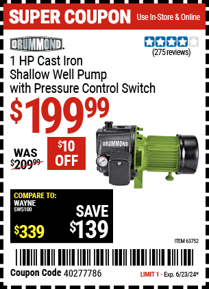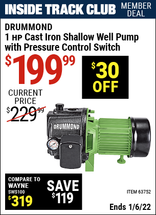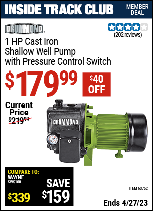 ITC DRUMMOND 1 HP CAST IRON SHALLOW WELL PUMP WITH PRESSURE CONTROL SWITCH Lot No. 63752 Expired: 1/6/22 - $199.99 Coupon Code: 'n/a'