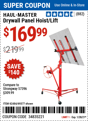 DRYWALL PANEL HOIST/LIFT Lot No. 62484/69377 Expired: 1/28/21 - $169.99 Coupon Code: '43564038'