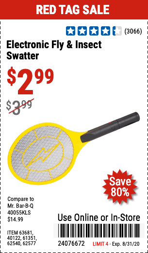 ELECTRIC FLY & INSECT SWATTER Lot No. 63681/40122/61351/62540/62577 Expired: 8/31/20 - $2.99 Coupon Code: '24076672'