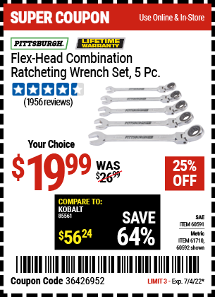 FLEX-HEAD COMBINATION RATCHETING WRENCH SET, 5 PC. Lot No. 60591/61710/60592 Expired: 4/24/22 - $19.99 Coupon Code: '21573058'