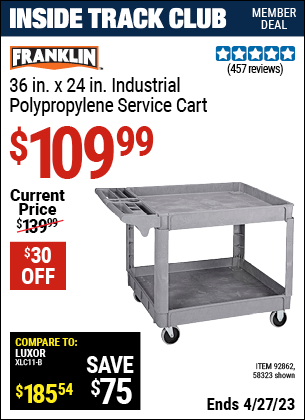 ITC FRANKLIN 36 IN. X 24 IN., 2-SHELF UTILITY CART Lot No. 58323 Valid Thru: 1/1/26 - $99.99 Coupon Code: 'n/a' (current price - 20% = 0) add to list