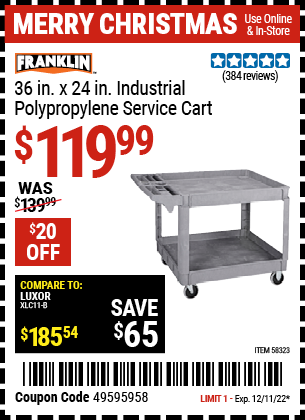 FRANKLIN 36 IN. X 24 IN., 2-SHELF UTILITY CART Lot No. 58323 Expired: 12/11/22 - $119.99 Coupon Code: '49595958'