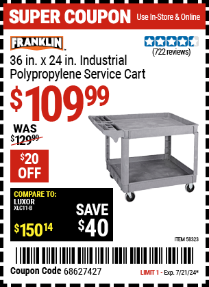 FRANKLIN 36 IN. X 24 IN., 2-SHELF UTILITY CART Lot No. 58323 Expired: 7/21/24 - $109.99 Coupon Code: '68627427'