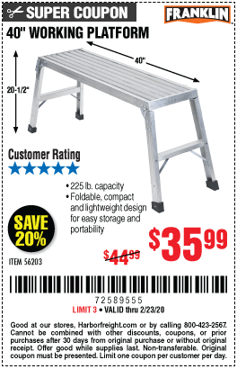 FRANKLIN 40 IN. LIGHTWEIGHT ALUMINUM WORK PLATFORM Lot No. 56203 Expired: 2/23/20 - $35.99 Coupon Code: '72589555'