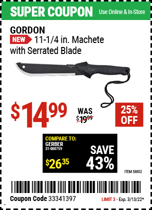 GORDON 11-1/4 IN. MACHETE WITH SERRATED BLADE Lot No. 58852 Expired: 3/13/22 - $14.99 Coupon Code: '33341397'