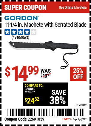GORDON 11-1/4 IN. MACHETE WITH SERRATED BLADE Lot No. 58852 Expired: 7/4/22 - $14.99 Coupon Code: '22691059'
