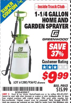GREENWOOD 1-1/4 GALLON HOME AND GARDEN SPRAYER Lot No. 63124/63145 Expired: 11/14/15 - $8.99 Coupon Code: '20297052'