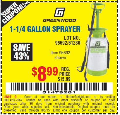 GREENWOOD 1-1/4 GALLON HOME AND GARDEN SPRAYER Lot No. 63124/63145 Expired: 8/5/15 - $8.99 Coupon Code: '51479261'