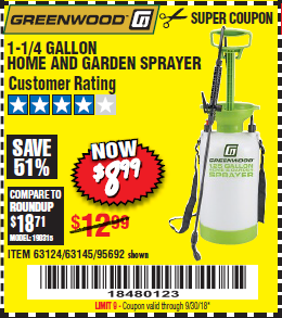 GREENWOOD 1-1/4 GALLON HOME AND GARDEN SPRAYER Lot No. 63124/63145 Expired: 9/9/18 - $8.99 Coupon Code: '47861694'
