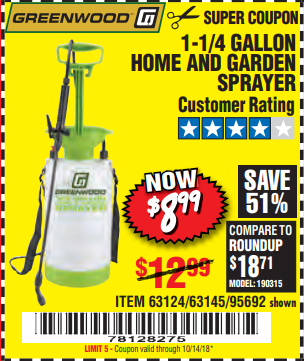 GREENWOOD 1-1/4 GALLON HOME AND GARDEN SPRAYER Lot No. 63124/63145 Expired: 10/14/18 - $8.99 Coupon Code: '78128275'
