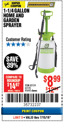 GREENWOOD 1-1/4 GALLON HOME AND GARDEN SPRAYER Lot No. 63124/63145 Expired: 7/15/18 - $8.99 Coupon Code: '35732237'