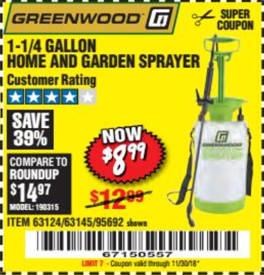 GREENWOOD 1-1/4 GALLON HOME AND GARDEN SPRAYER Lot No. 63124/63145 Expired: 11/30/18 - $8.99 Coupon Code: '91734289'