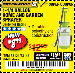 GREENWOOD 1-1/4 GALLON HOME AND GARDEN SPRAYER Lot No. 63124/63145 Expired: 6/30/19 - $8.99 Coupon Code: '90504911'