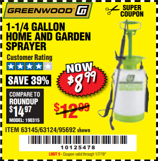 GREENWOOD 1-1/4 GALLON HOME AND GARDEN SPRAYER Lot No. 63124/63145 Expired: 1/17/19 - $8.99 Coupon Code: '10125478'