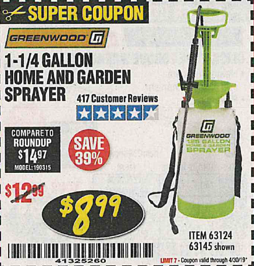 GREENWOOD 1-1/4 GALLON HOME AND GARDEN SPRAYER Lot No. 63124/63145 Expired: 4/30/19 - $8.99 Coupon Code: '41325260'