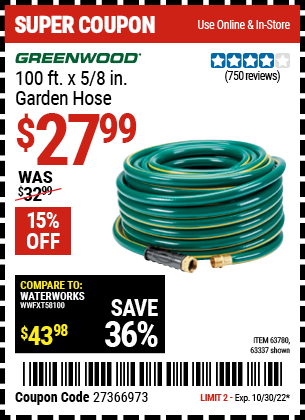 GREENWOOD 100 FT. X 5/8 IN. GARDEN HOSE Lot No. 63337 Expired: 10/30/22 - $27.99 Coupon Code: 'n/a'