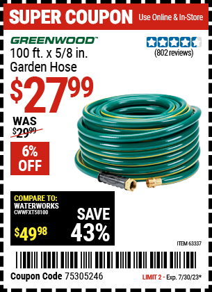 GREENWOOD 100 FT. X 5/8 IN. GARDEN HOSE Lot No. 63337 Expired: 7/30/23 - $27.99 Coupon Code: '75305246'