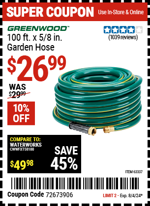 GREENWOOD 100 FT. X 5/8 IN. GARDEN HOSE Lot No. 63337 Expired: 8/4/24 - $26.99 Coupon Code: '72673906'