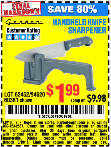 HANDHELD KNIFE SHARPENER Lot No. 60361/62452 Expired: 3/19/16 - $1.99 Coupon Code: '13339858'