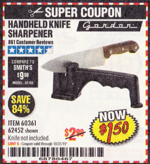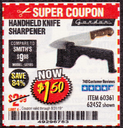 HANDHELD KNIFE SHARPENER Lot No. 60361/62452 Expired: 8/31/19 - $1.5 Coupon Code: '49296783'