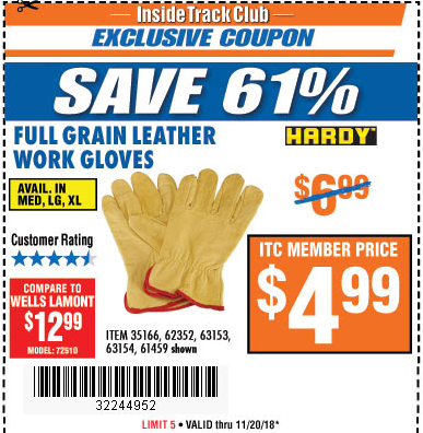 ITC HARDY FULL-GRAIN COWHIDE LEATHER WORK GLOVES Lot No. 61459/63153/63154 Expired: 11/20/18 - $4.99 Coupon Code: '32244952'