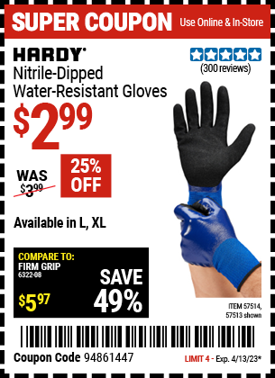 HARDY NITRILE DIPPED WATERPROOF GLOVES X-LARGE Lot No. 57514 Expired: 4/13/23 - $2.99 Coupon Code: '94861447'