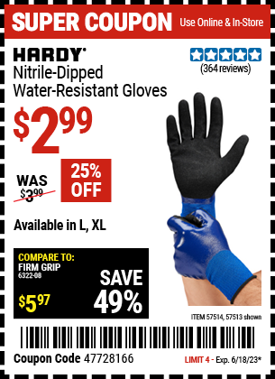 HARDY NITRILE DIPPED WATERPROOF GLOVES X-LARGE Lot No. 57514 Expired: 6/18/23 - $2.99 Coupon Code: '47728166'