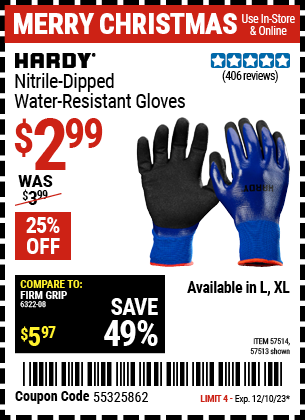 HARDY NITRILE DIPPED WATERPROOF GLOVES X-LARGE Lot No. 57514 Expired: 12/10/23 - $2.99 Coupon Code: '55325862'