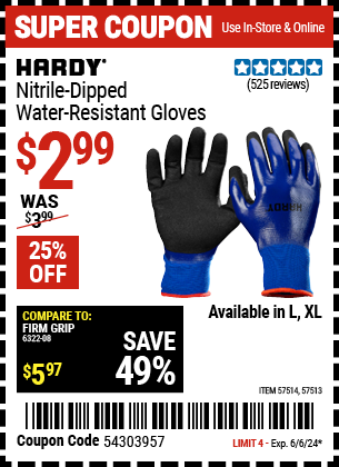 HARDY NITRILE-DIPPED WATER-RESISTANT GLOVES Lot No. 57514/57513 Expired: 6/6/24 - $2.99 Coupon Code: '54303957'