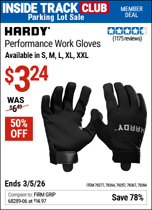 ITC HARDY PERFORMANCE WORK GLOVES Lot No. 70257/70264/70266/70267/70277 Valid Thru: 3/5/26 - $3.24 Coupon Code: 'n/a' (current price - 20% = 0) add to list