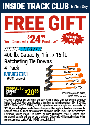 FREE HAUL MASTER 4 PIECE, 1" X 15FT. RATCHETING TIE DOWNS Lot No. 90984/63056/63057/63150/56668/63094 Expired: 1/8/22 - FWP Coupon Code: 'n/a'