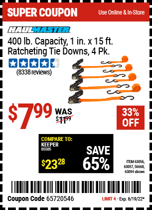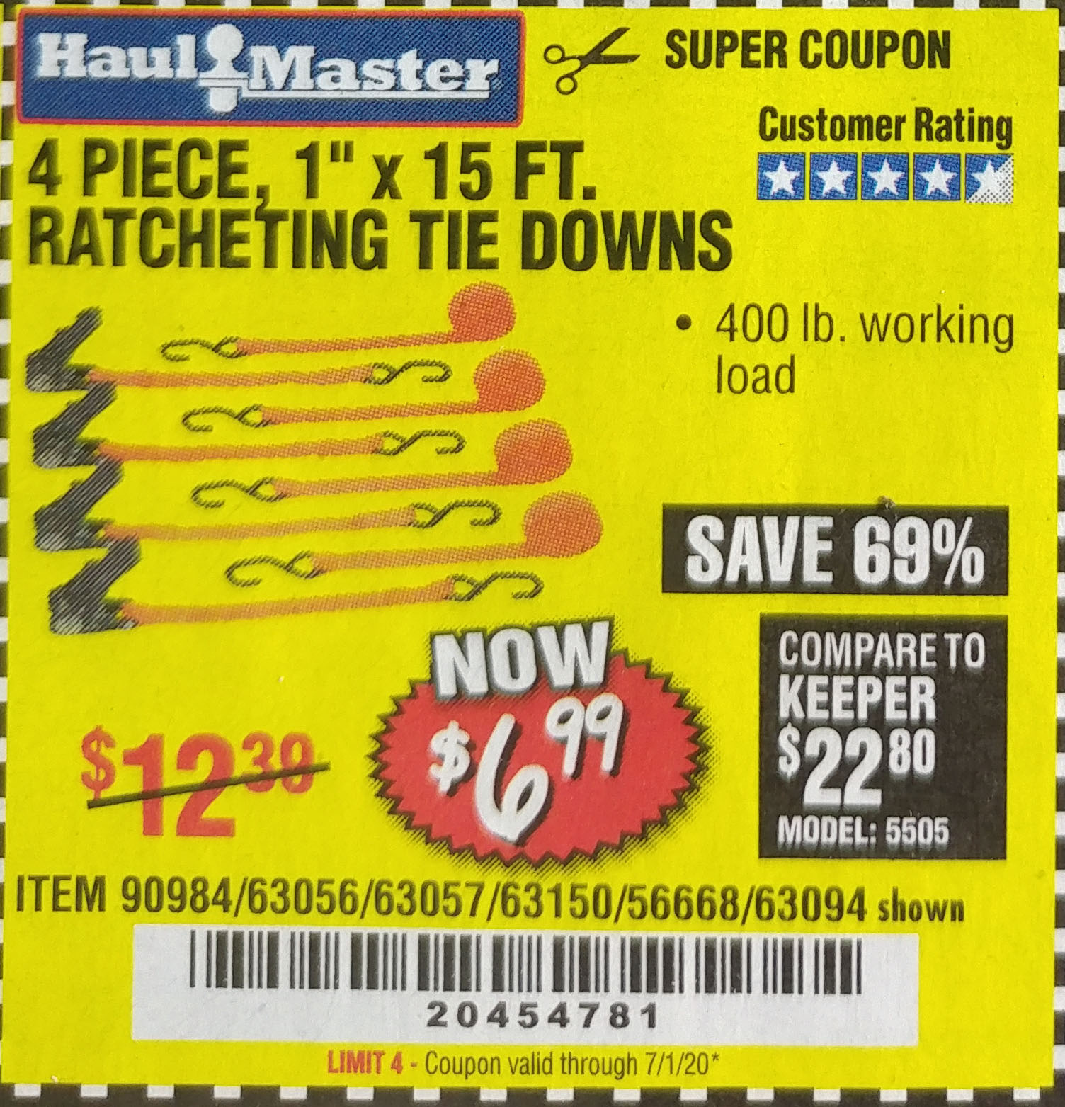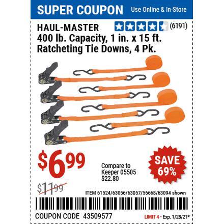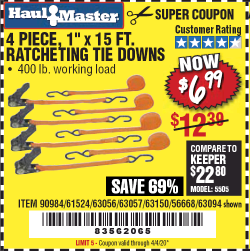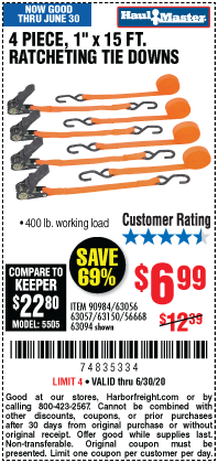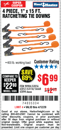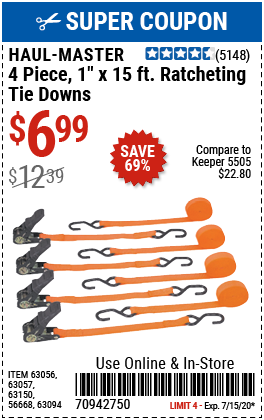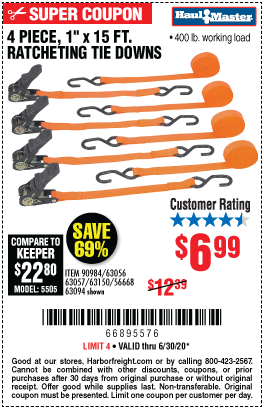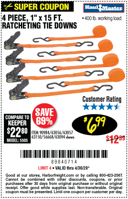 HAUL MASTER 4 PIECE, 1" X 15FT. RATCHETING TIE DOWNS Lot No. 90984/63056/63057/63150/56668/63094 Expired: 6/30/20 - $6.99 Coupon Code: '89840714'