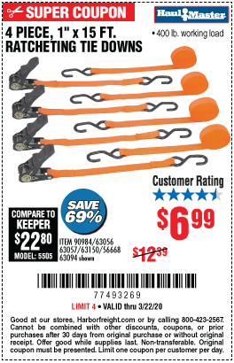 HAUL MASTER 4 PIECE, 1" X 15FT. RATCHETING TIE DOWNS Lot No. 90984/63056/63057/63150/56668/63094 Expired: 3/22/20 - $6.99 Coupon Code: '77493269'