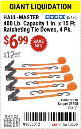 HAUL MASTER 4 PIECE, 1" X 15FT. RATCHETING TIE DOWNS Lot No. 90984/63056/63057/63150/56668/63094 Expired: 9/30/20 - $6.99 Coupon Code: '18107158'
