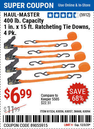 HAUL MASTER 4 PIECE, 1" X 15FT. RATCHETING TIE DOWNS Lot No. 90984/63056/63057/63150/56668/63094 Expired: 12/3/20 - $6.99 Coupon Code: '89055915'