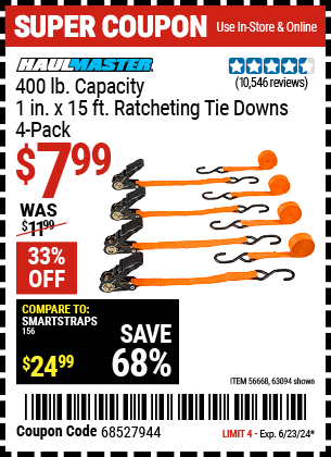HAUL MASTER 4 PIECE, 1" X 15FT. RATCHETING TIE DOWNS Lot No. 90984/63056/63057/63150/56668/63094 Expired: 6/23/24 - $7.99 Coupon Code: '68527944'