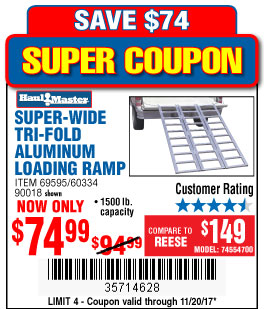HAUL-MASTER 1500 LB. CAPACITY, 69 IN. X 45 IN. TRI-FOLD ALUMINUM LOADING RAMP Lot No. 90018 Expired: 11/20/17 - $74.99 Coupon Code: '35714628'