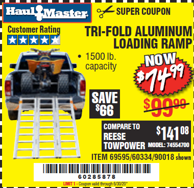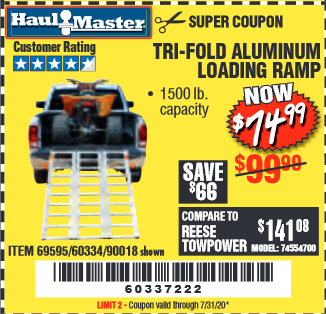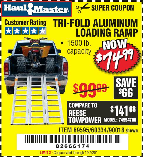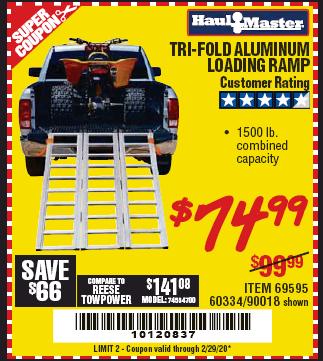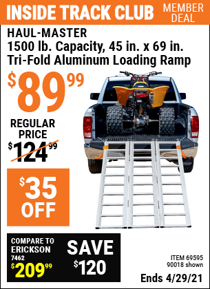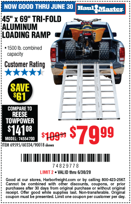 HAUL-MASTER 1500 LB. CAPACITY, 69 IN. X 45 IN. TRI-FOLD ALUMINUM LOADING RAMP Lot No. 90018 Expired: 2/29/20 - $74.99 Coupon Code: '10120837'