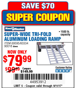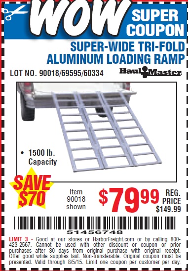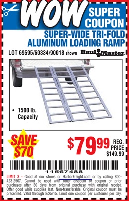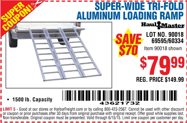 HAUL-MASTER 1500 LB. CAPACITY, 69 IN. X 45 IN. TRI-FOLD ALUMINUM LOADING RAMP Lot No. 90018 Expired: 8/5/15 - $79.99 Coupon Code: '51456748'