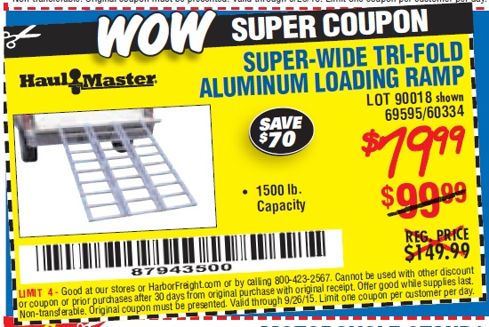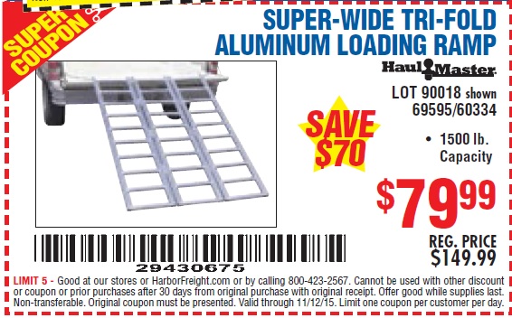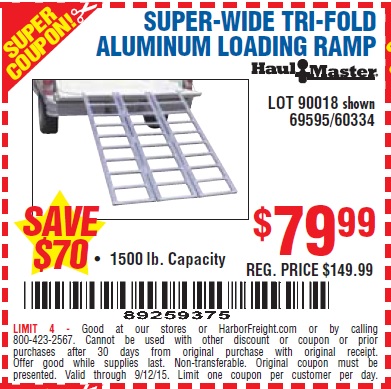 HAUL-MASTER 1500 LB. CAPACITY, 69 IN. X 45 IN. TRI-FOLD ALUMINUM LOADING RAMP Lot No. 90018 Expired: 9/26/15 - $79.99 Coupon Code: '87943500'