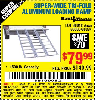 HAUL-MASTER 1500 LB. CAPACITY, 69 IN. X 45 IN. TRI-FOLD ALUMINUM LOADING RAMP Lot No. 90018 Expired: 2/1/16 - $79.99 Coupon Code: '39199992'