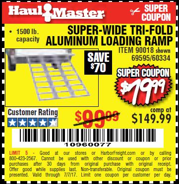 HAUL-MASTER 1500 LB. CAPACITY, 69 IN. X 45 IN. TRI-FOLD ALUMINUM LOADING RAMP Lot No. 90018 Expired: 7/7/17 - $79.99 Coupon Code: '10960077'