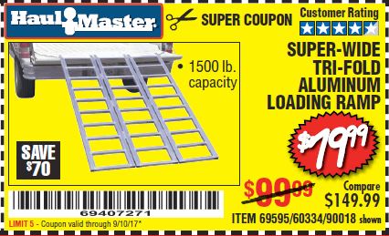 HAUL-MASTER 1500 LB. CAPACITY, 69 IN. X 45 IN. TRI-FOLD ALUMINUM LOADING RAMP Lot No. 90018 Expired: 9/10/17 - $79.99 Coupon Code: '69407271'