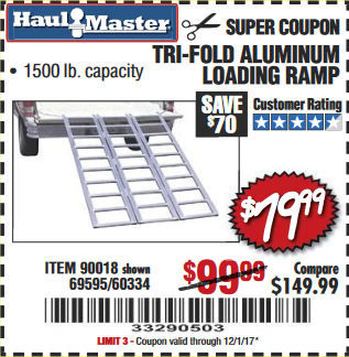 HAUL-MASTER 1500 LB. CAPACITY, 69 IN. X 45 IN. TRI-FOLD ALUMINUM LOADING RAMP Lot No. 90018 Expired: 12/1/17 - $79.99 Coupon Code: '33290503'
