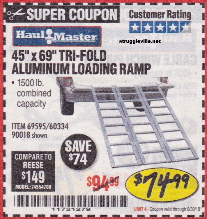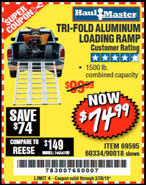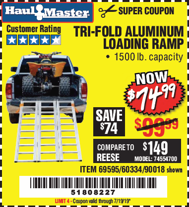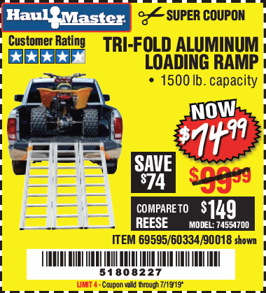 HAUL-MASTER 1500 LB. CAPACITY, 69 IN. X 45 IN. TRI-FOLD ALUMINUM LOADING RAMP Lot No. 90018 Expired: 3/30/19 - $74.99 Coupon Code: '78300765'