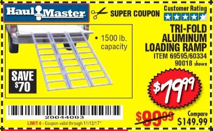 HAUL-MASTER 1500 LB. CAPACITY, 69 IN. X 45 IN. TRI-FOLD ALUMINUM LOADING RAMP Lot No. 90018 Expired: 11/12/17 - $79.99 Coupon Code: '20044003'