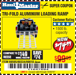 HAUL-MASTER 1500 LB. CAPACITY, 69 IN. X 45 IN. TRI-FOLD ALUMINUM LOADING RAMP Lot No. 90018 Expired: 10/30/18 - $74.99 Coupon Code: '11647694'