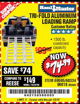 HAUL-MASTER 1500 LB. CAPACITY, 69 IN. X 45 IN. TRI-FOLD ALUMINUM LOADING RAMP Lot No. 90018 Expired: 1/5/19 - $74.99 Coupon Code: '64218586'